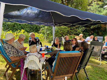 Vi mødtes kl. 12 til TakeAway frokost på Nannasvej, 20 voksne, 8 børn og 3 små børn. Dagen tilbragtes på Nannasvej med hyggelig snak og leg (mest børnene) i haven under pavillonerne, i lysthuset og i det nyindrettede lille havehus - og nogen tog sig en lur. Siden blev der serveret kaffe, te og dejlige kager. Vejret var vi heldige med, overskyet og med varsel om voldsom regn og blæst senere på dagen. Men regnen og blæsten kom først kort før kl. 17 hvor der var almindelig opbrud, og energiske folk havde i tide fået taget pavillonerne ned.